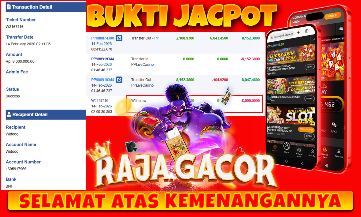 "Tanggal 14-02-2026 Selamat kepada member kami ID jefr*** telah memenangkan nominal 2.7 juta!"