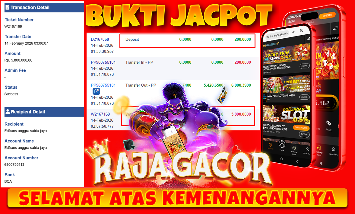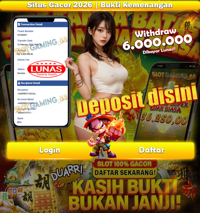 "Tanggal 13-02-2026 Selamat kepada member kami ID fran*** telah memenangkan nominal 5.8 juta!"