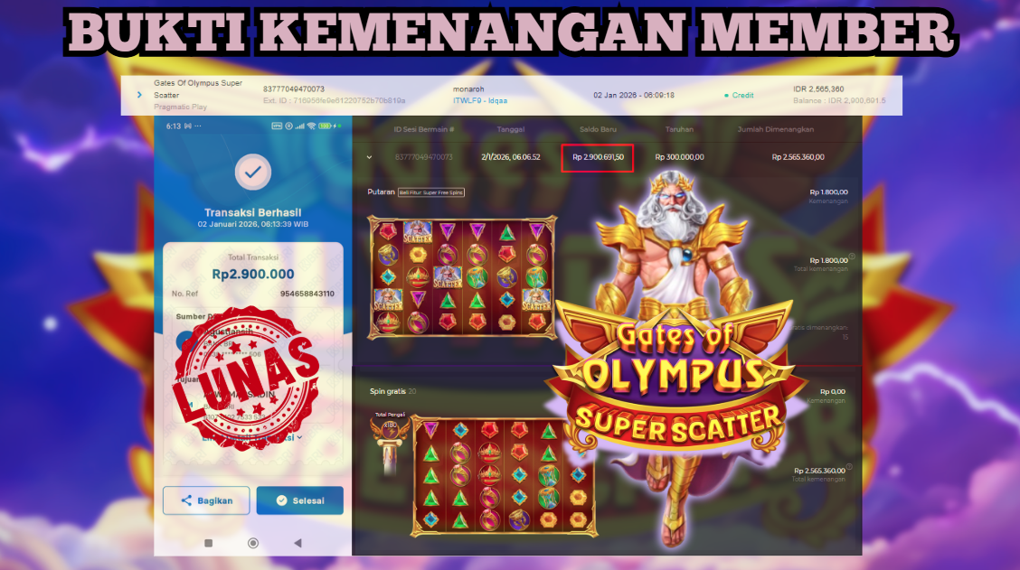 "Tanggal 02-01-2026 Selamat kepada member kami ID MON*** memenangkan nominal 2.9 juta!"
