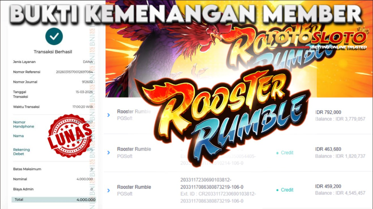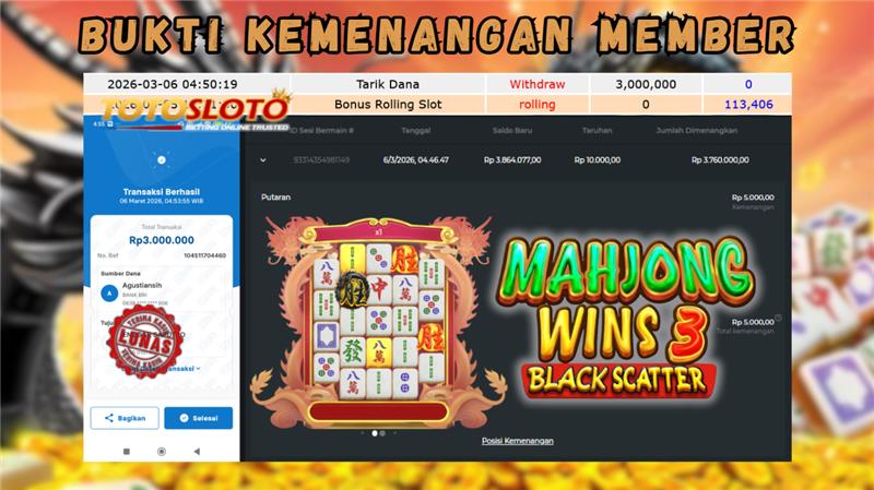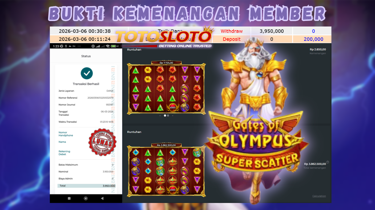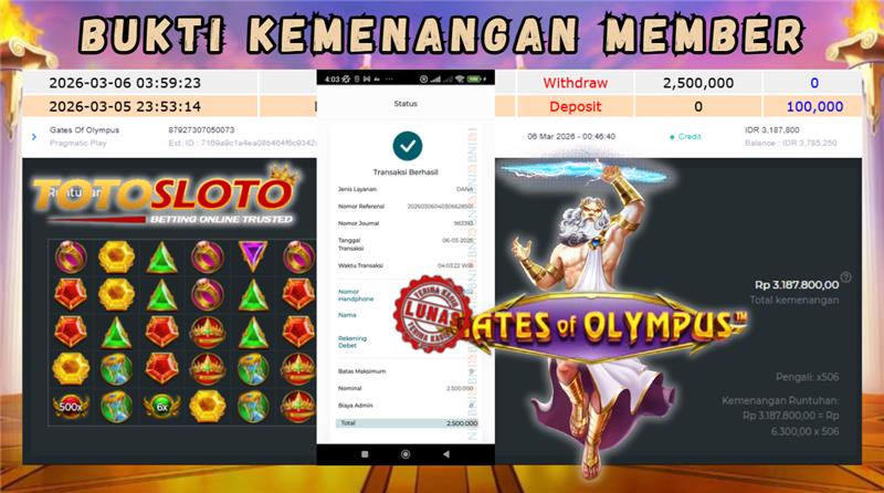 "Tanggal 06-03-2026 Selamat kepada member kami ZR4*** memenangkan nominal 3 juta!"
