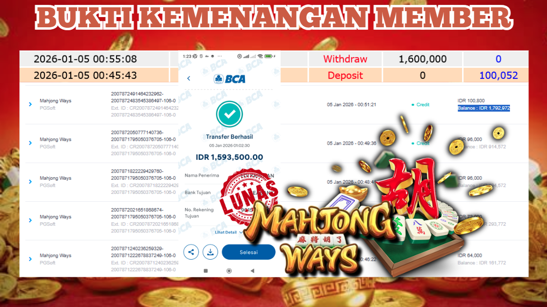 "Tanggal 05-01-2026 Selamat kepada member kami EDI*** memenangkan nominal 1.6 juta!"