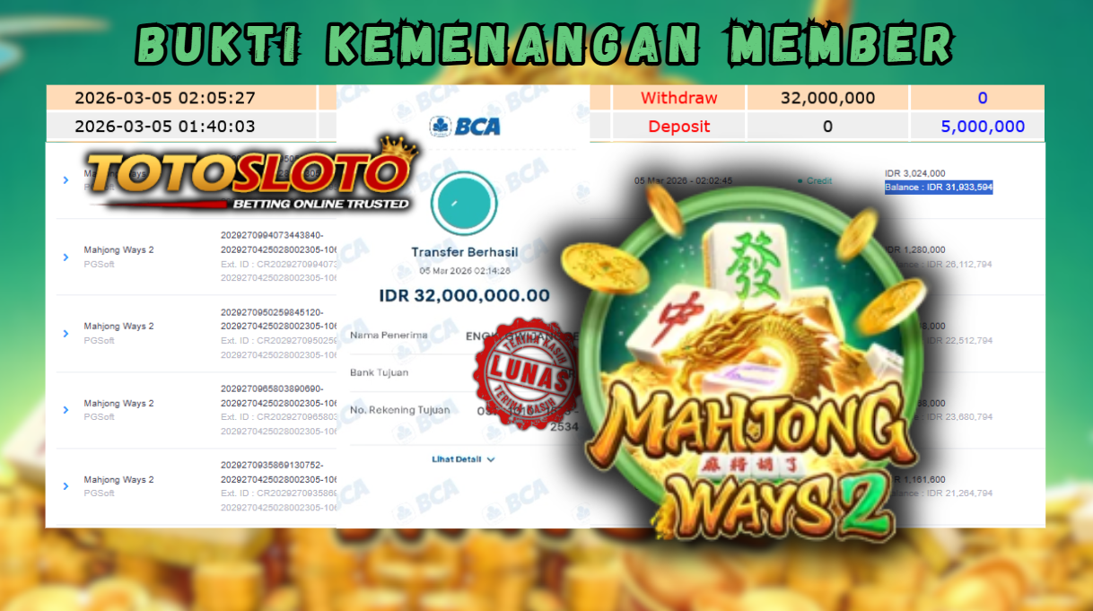 "Tanggal 05-03-2026 Selamat kepada member kami EVE*** memenangkan nominal 32 juta!"