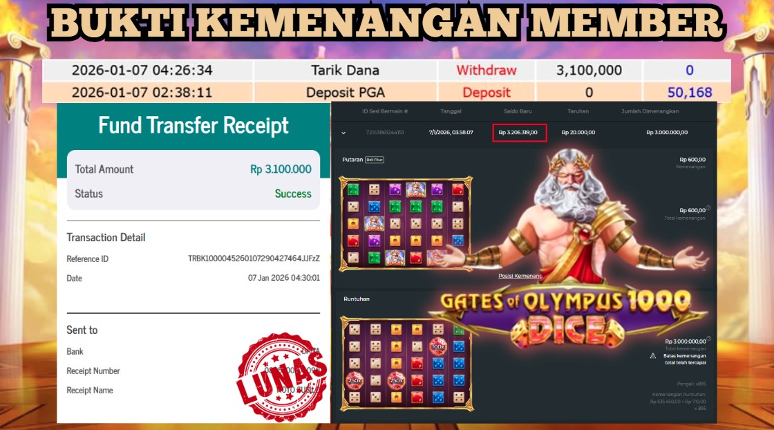 "Tanggal 03-01-2026 Selamat kepada member kami ID DAM*** memenangkan nominal 3 juta!"