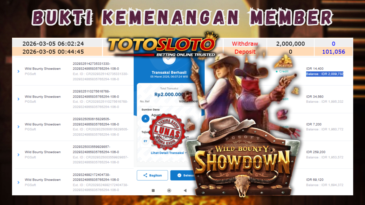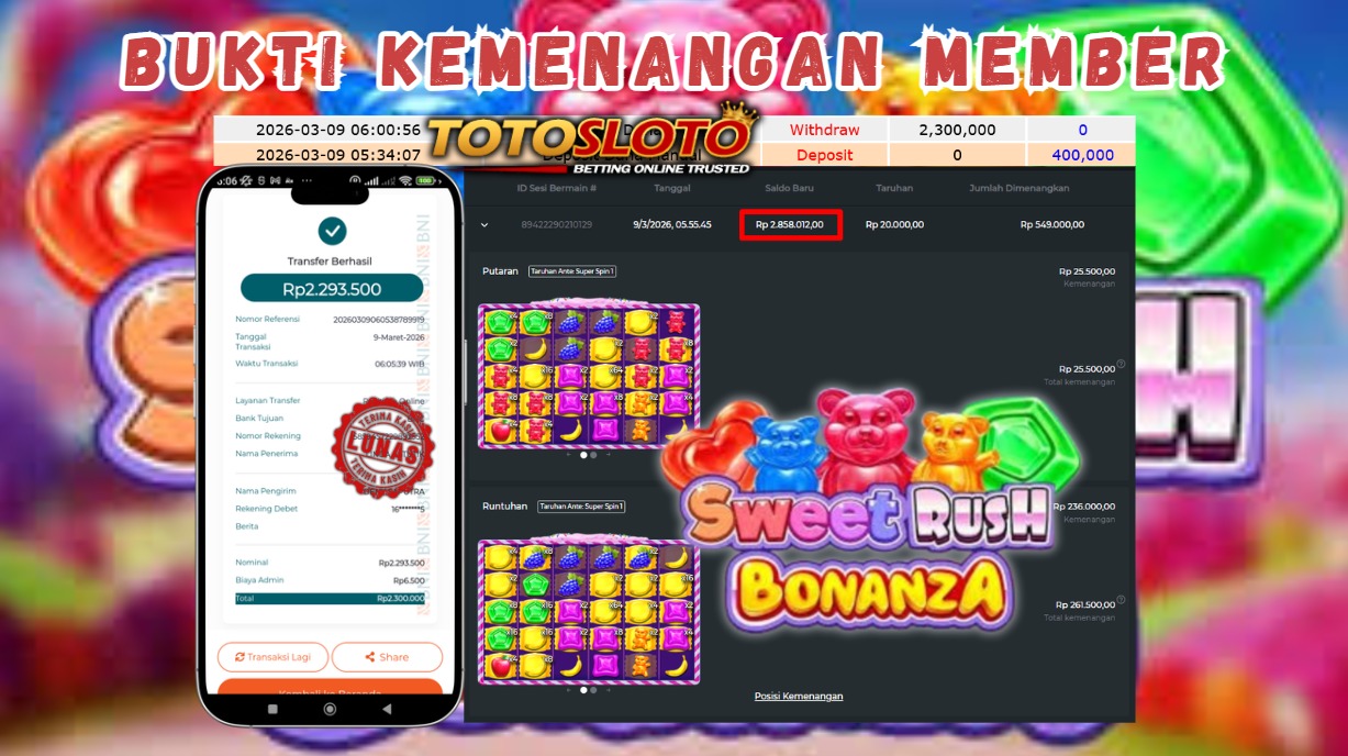 "Tanggal 09-03-2026 Selamat kepada member kami LIN*** memenangkan nominal 2.3 juta!"