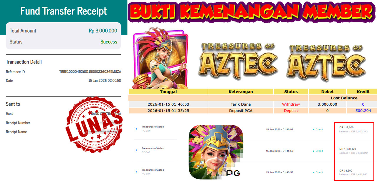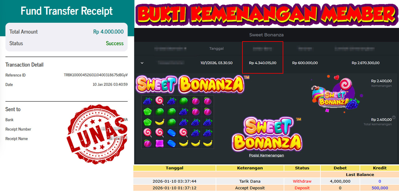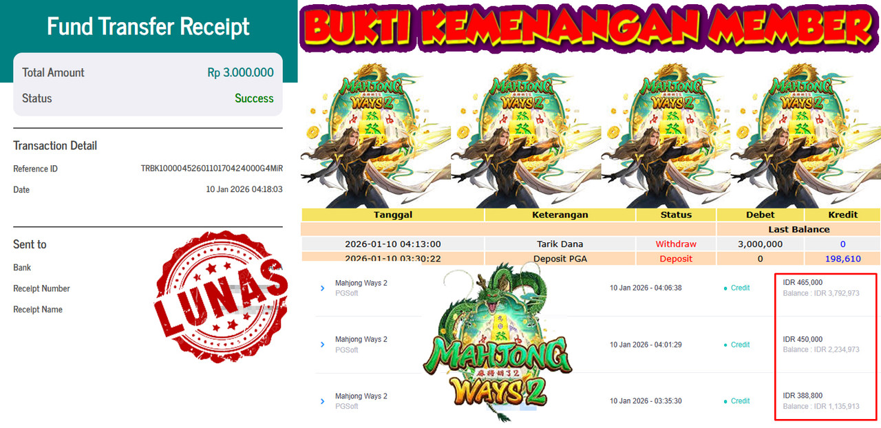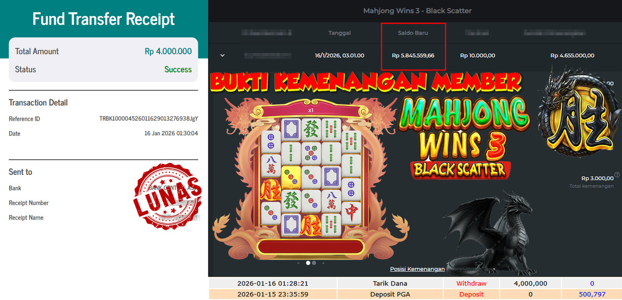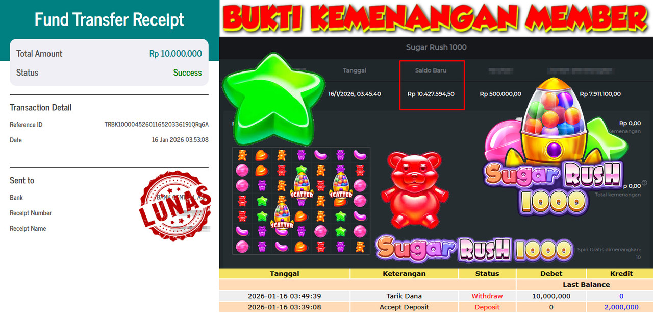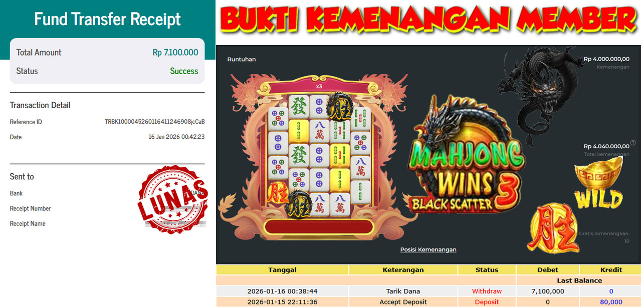 "Tanggal 15-01-2026 Selamat kepada member kami GEND*** memenangkan nominal 3 juta!"