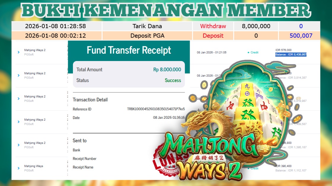 "Tanggal 12-01-2026 Selamat kepada member kami ENG*** memenangkan nominal 8 juta!"