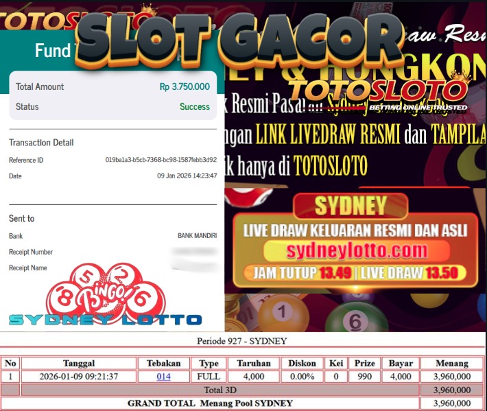 "Tanggal 13-01-2026 Selamat kepada member kami BENJ*** memenangkan nominal 3.8 juta!"