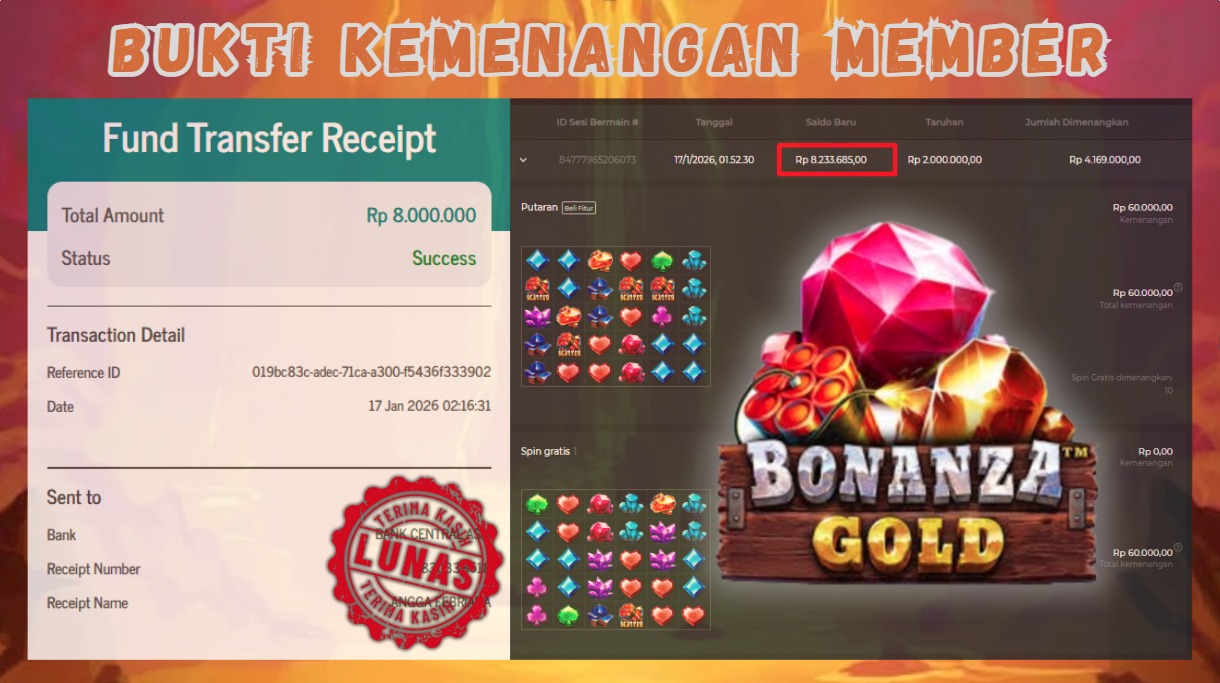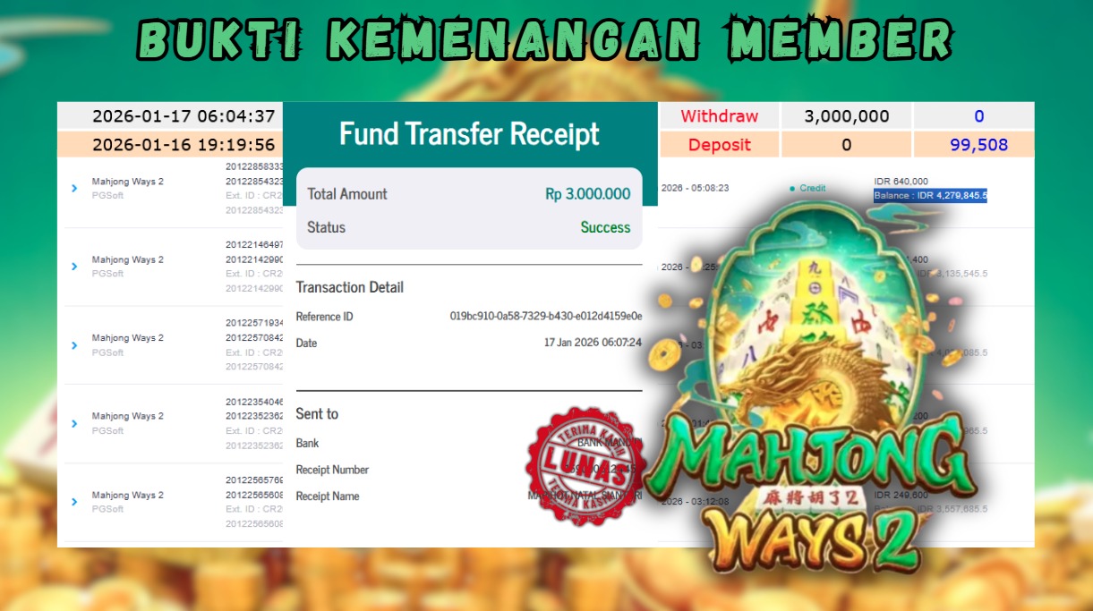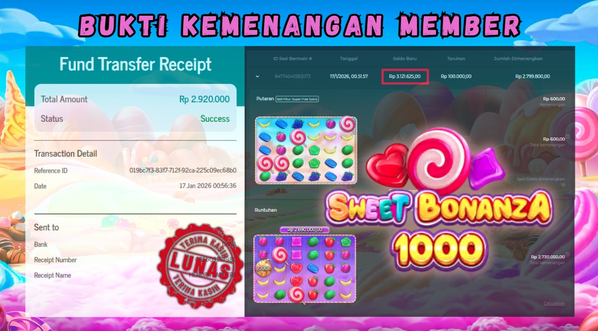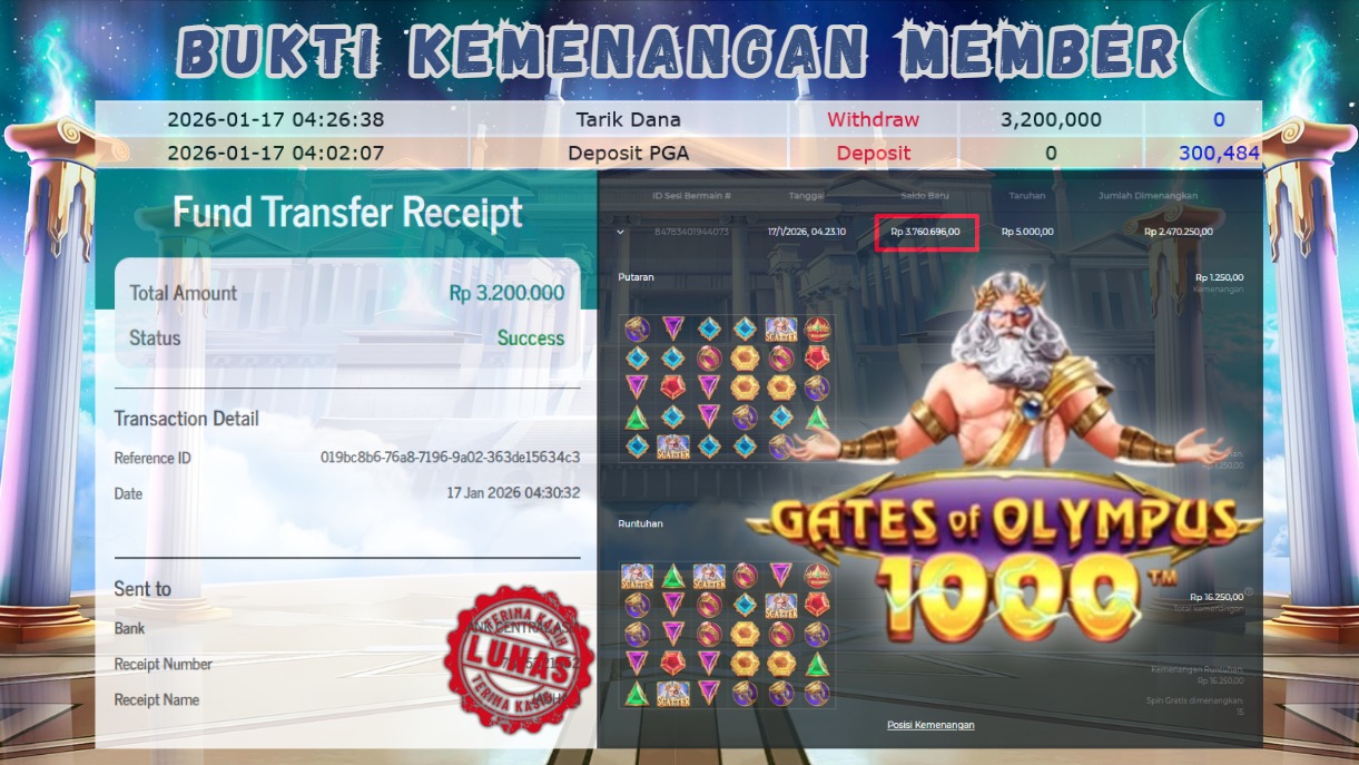 "Tanggal 17-01-2026 Selamat kepada member kami SAR*** memenangkan nominal 3 juta!"