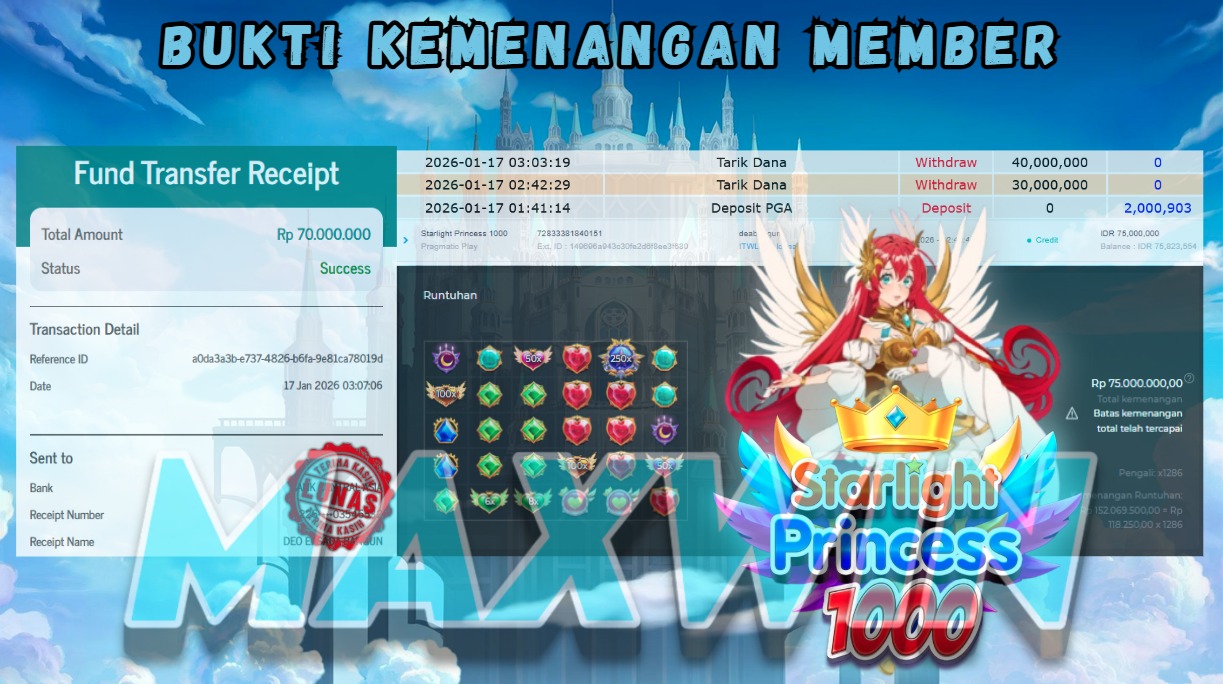 "Tanggal 17-01-2026 Selamat kepada member kami DEA*** memenangkan nominal 70 juta!"
