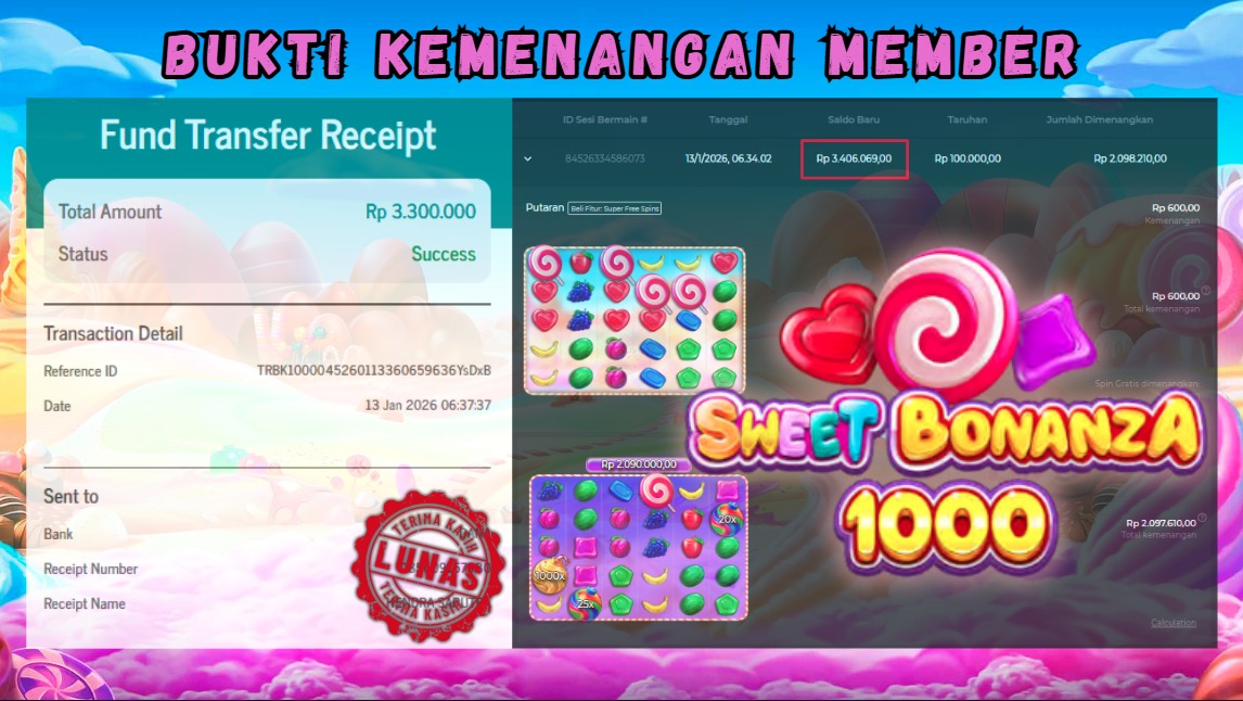"Tanggal 03-01-2026 Selamat kepada member kami ID THOR*** memenangkan nominal 1.3 juta!"