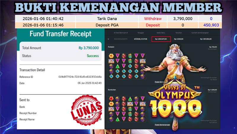 "Tanggal 01-01-2026 Selamat kepada member kami ID ALFAR*** memenangkan nominal 3.9 juta!"