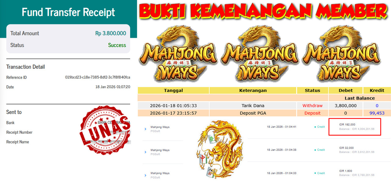 "Tanggal 18-01-2026 Selamat kepada member kami ASI*** memenangkan nominal 3.8 juta!"