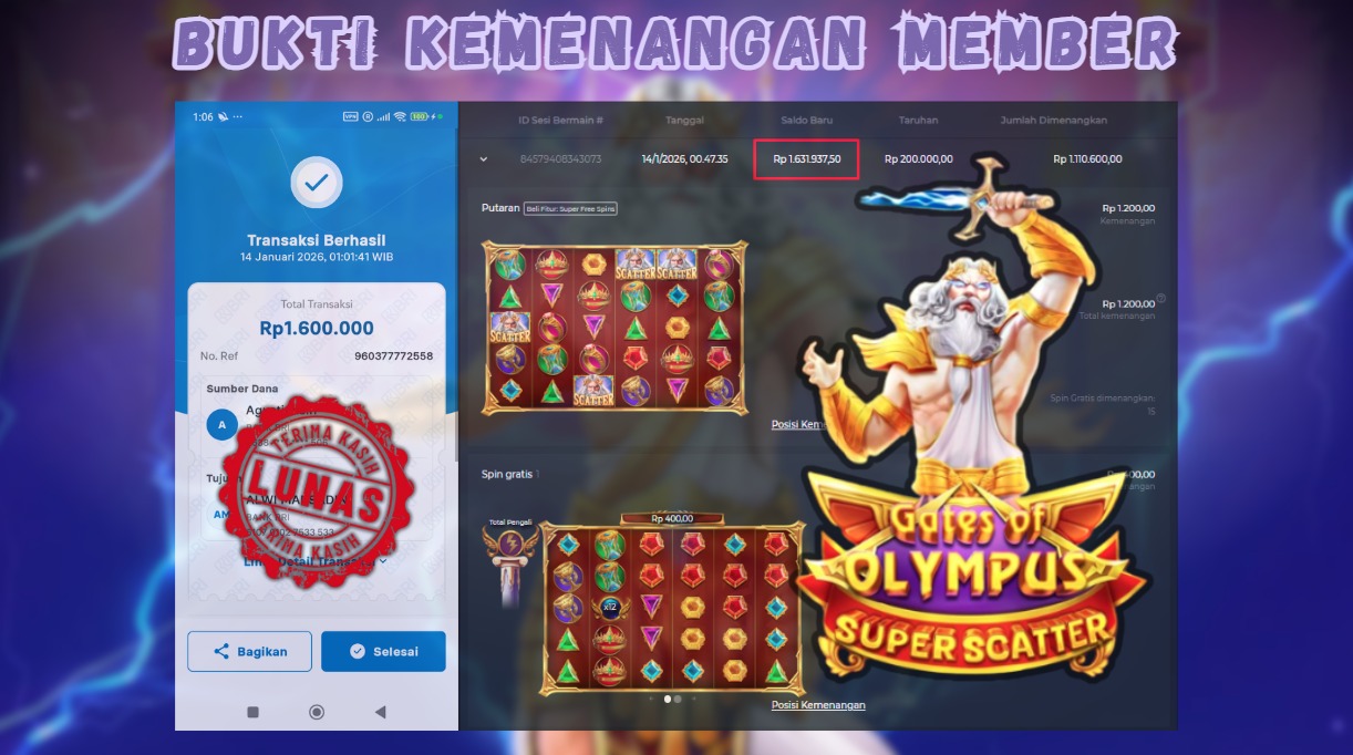 "Tanggal 14-01-2026 Selamat kepada member kami MON*** memenangkan nominal 1.6 juta!"