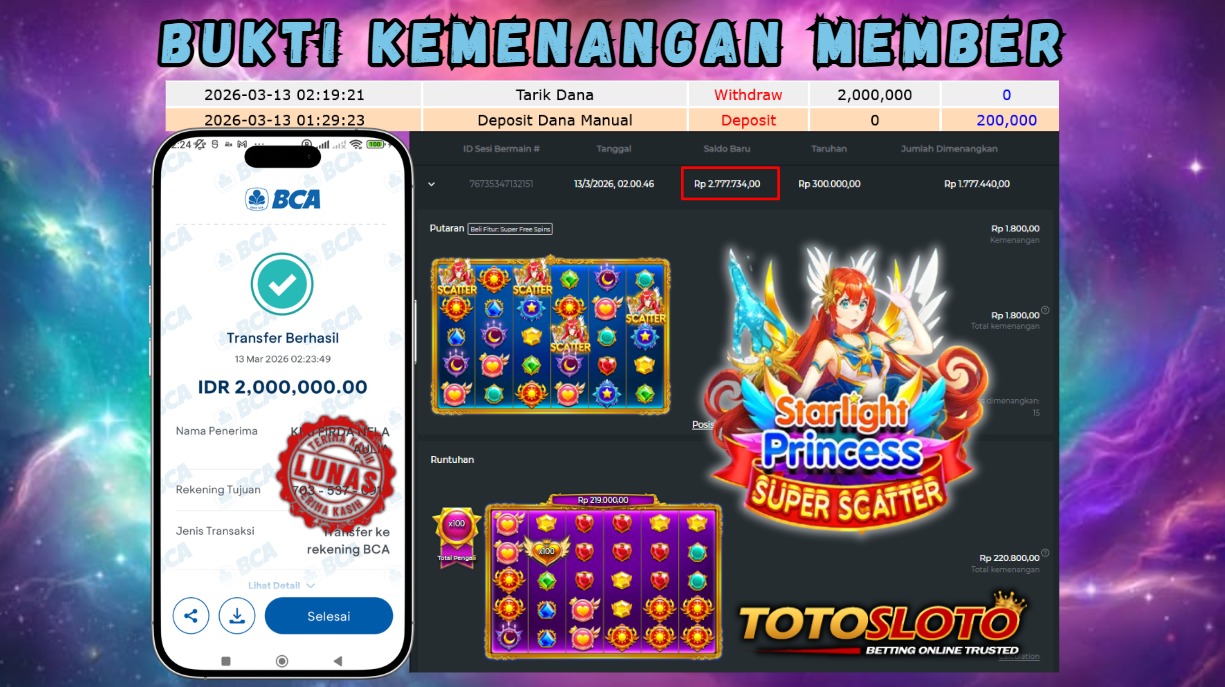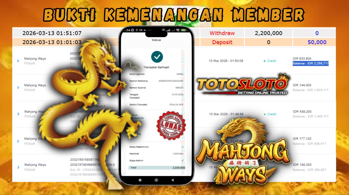 "Tanggal 13-03-2026 Selamat kepada member kami NON*** memenangkan nominal 2.2 juta!"