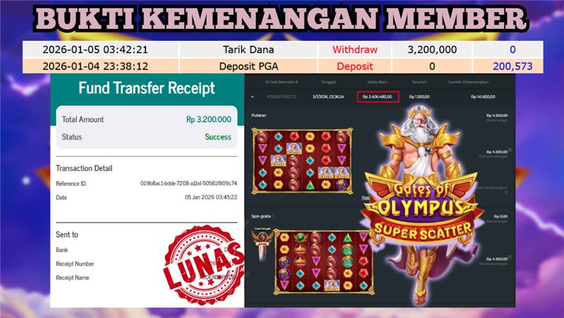 "Tanggal 05-01-2026 Selamat kepada member kami ARDE*** memenangkan nominal 3.2 juta!"