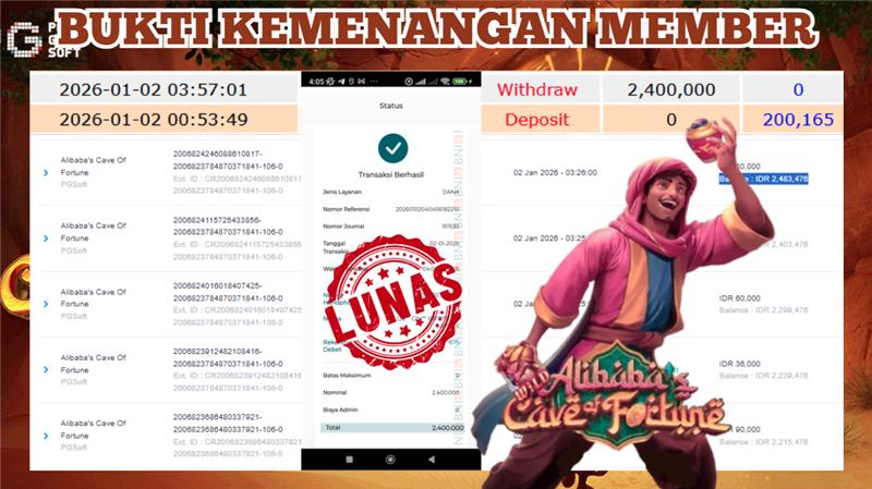 "Tanggal 02-01-2026 Selamat kepada member kami ID CING*** memenangkan nominal 2.4 juta!"