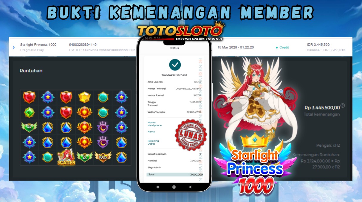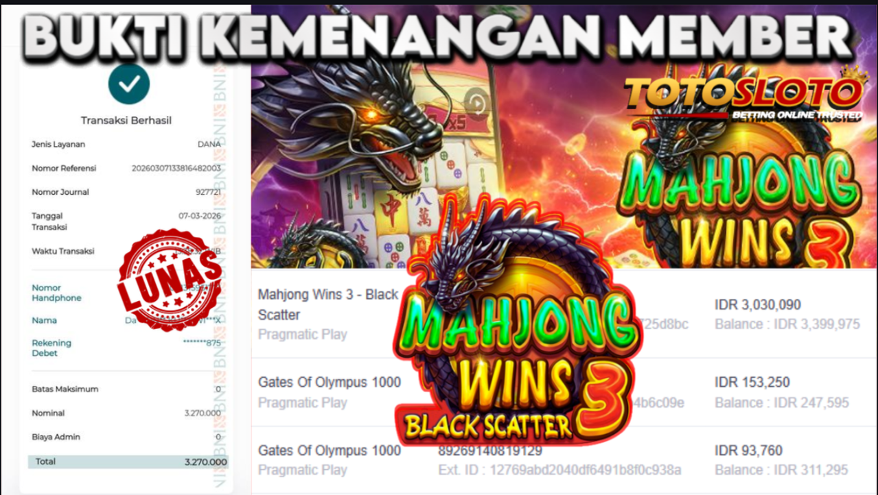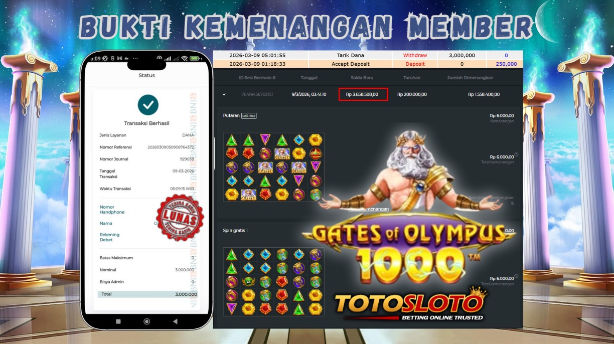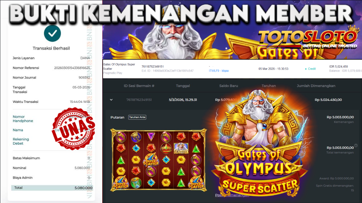 "Tanggal 15-03-2026 Selamat kepada member kami dangra*** memenangkan nominal 3 juta!"