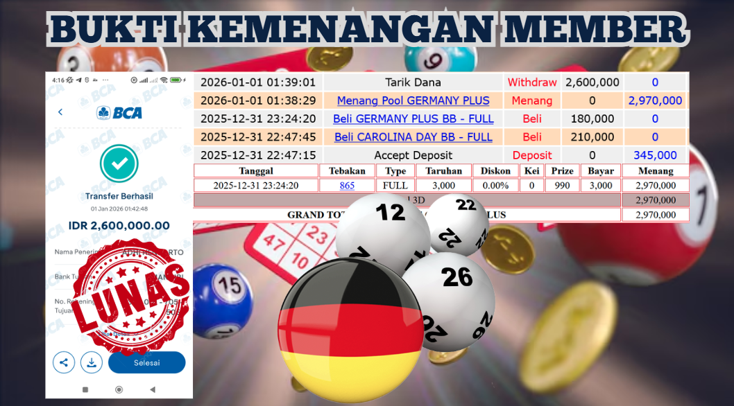 "Tanggal 01-01-2026 Selamat kepada member kami ID PENGGEM*** memenangkan nominal 4.5 juta!"