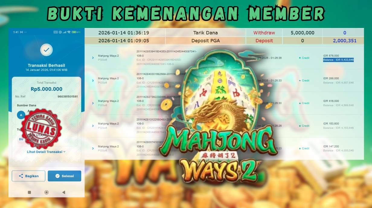 "Tanggal 14-01-2026 Selamat kepada member kami HZI*** memenangkan nominal 5 juta!"