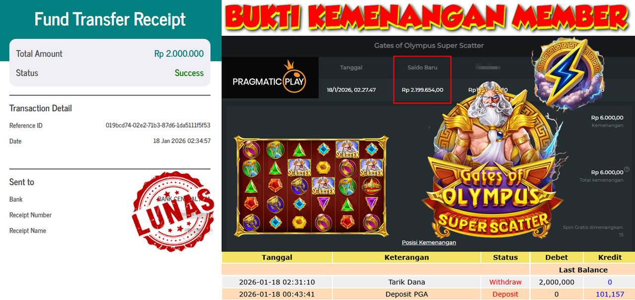 "Tanggal 18-01-2026 Selamat kepada member kami PAP*** memenangkan nominal 2 juta!"
