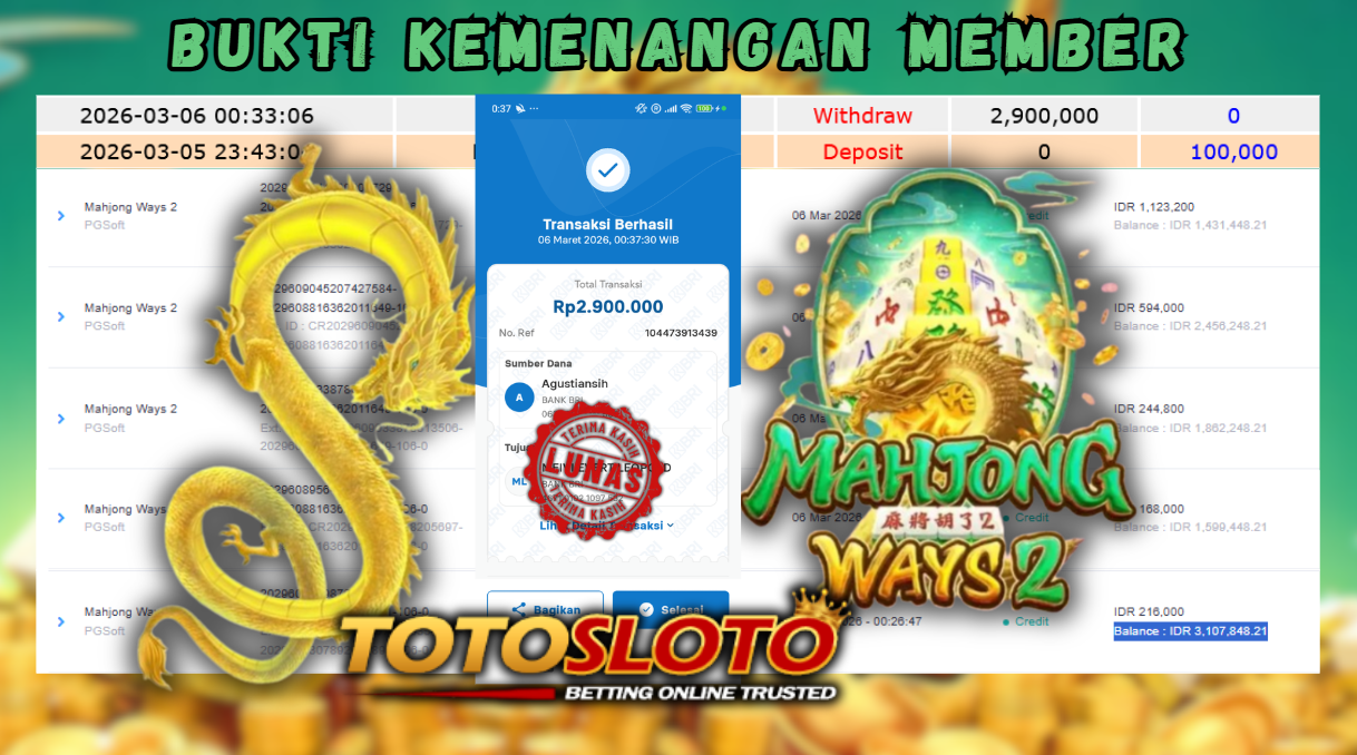 "Tanggal 06-03-2026 Selamat kepada member kami SEL*** memenangkan nominal 2.9 juta!"