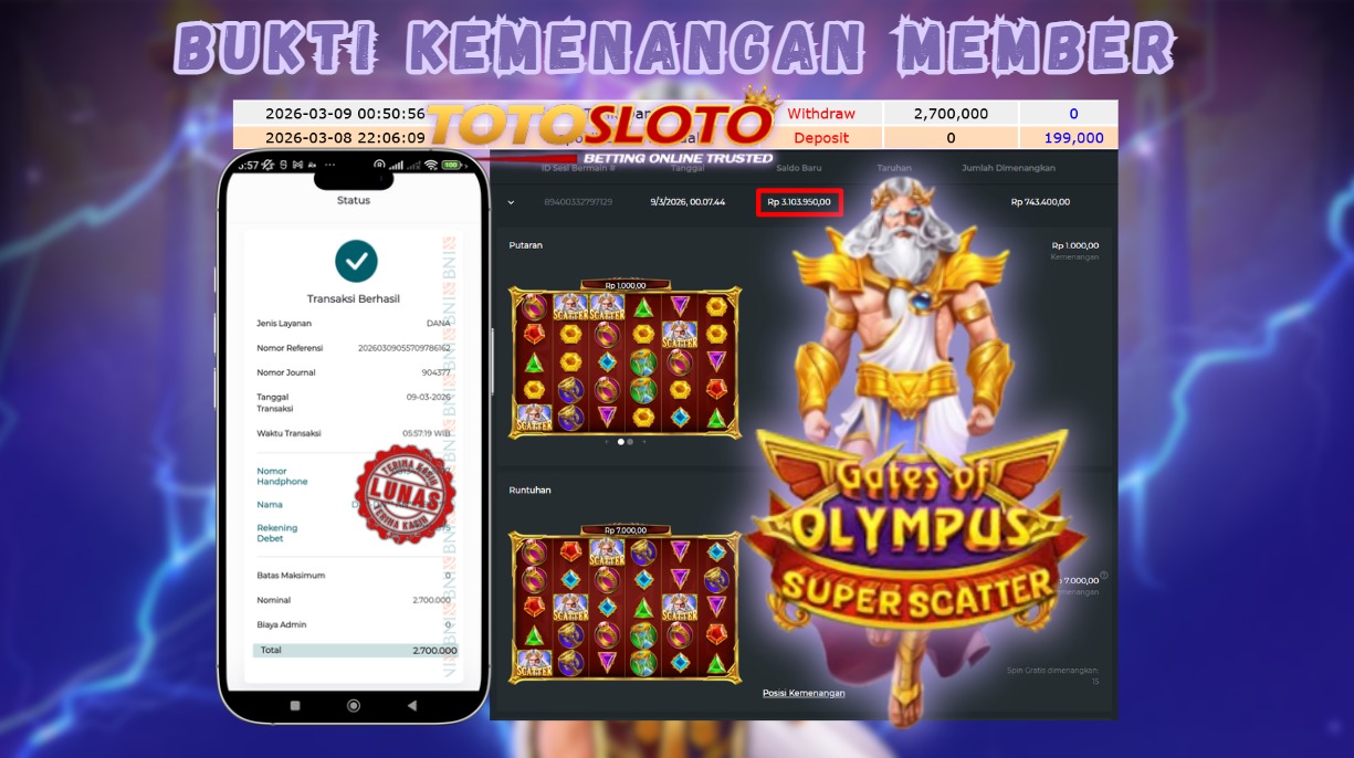"Tanggal 09-03-2026 Selamat kepada member kami MIS*** memenangkan nominal 2.7 juta!"