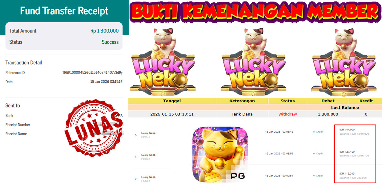 "Tanggal 15-01-2026 Selamat kepada member kami WIN*** memenangkan nominal 1.3 juta!"