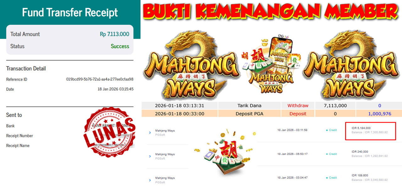 "Tanggal 18-01-2026 Selamat kepada member kami GAR*** memenangkan nominal 7.1 juta!"