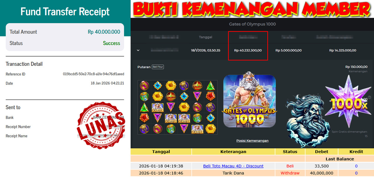 "Tanggal 18-01-2026 Selamat kepada member kami KOL*** memenangkan nominal 40 juta!"