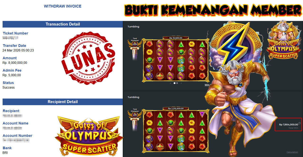 "Tanggal 03-03-2026 Selamat kepada member kami ZEUS*** memenangkan nominal 8.2 juta!"