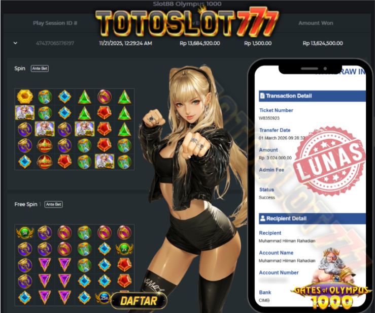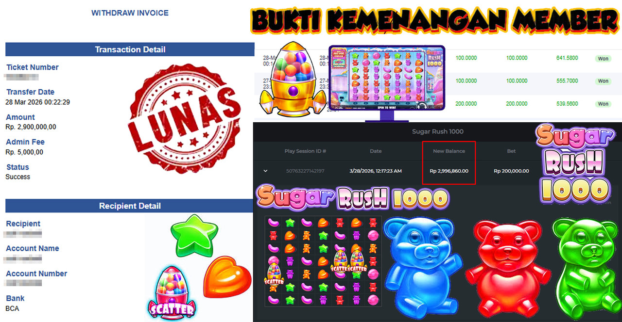 "Tanggal 01-03-2026 Selamat kepada member kami anti*** memenangkan nominal 3 juta!"