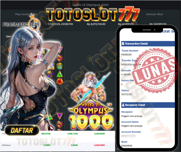"Tanggal 04-03-2026 Selamat kepada member kami PID*** memenangkan nominal 4.9 juta!"